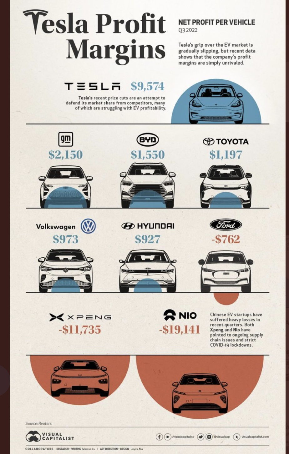 규모의 경제에서 테슬라는 그 어떤 전기차 및 레거시 회사보다 압도적인 전기차 생산을 하고 있으며 차한대당 수익은 2022년 3분기 기준