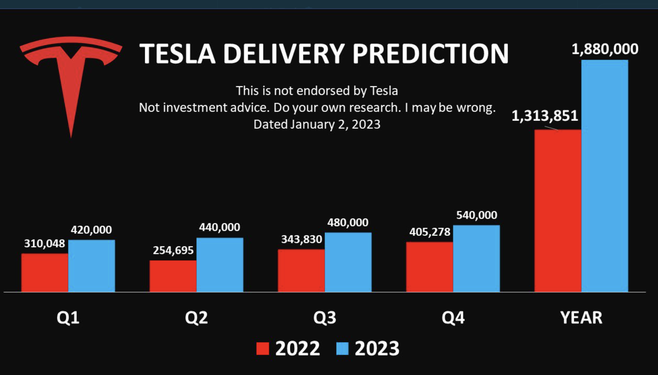 테슬라는 2023년 생산량을 최소 180만대 이상으로 보고 있으며 나의 예상은 올해 190만대~200만대 사이를 갈 것으로 본다.